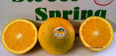 熊本産のスイートスプリングです。時期により、色が徐々に、オレンジ色にかわりますが、この緑色のスプリングって、お世辞にも美味しそうにみえません。でも食べたら、何故に、スイートスプリングって名前なのか何となく分かるような気がします。ほのかに酸味がありその中に甘さがあり、決して「すっぱく」ない味で甘さもあります。なんとなく春がきたかなぁーってイメージですかねぇ 八朔を連想させますが、果汁が多く八朔のようにパサパサしてません。八朔と比較すると、温州みかんをかけ合わせているだけ甘いと思いました。実は八朔と温州みかんのかけ合わせで作られた果物なのです。1月過ぎますと、ほとんど酸味を感じなくなり、甘さが前面にでた味覚になります。甘いが後をひかない甘さという感じです・・・果皮 緑